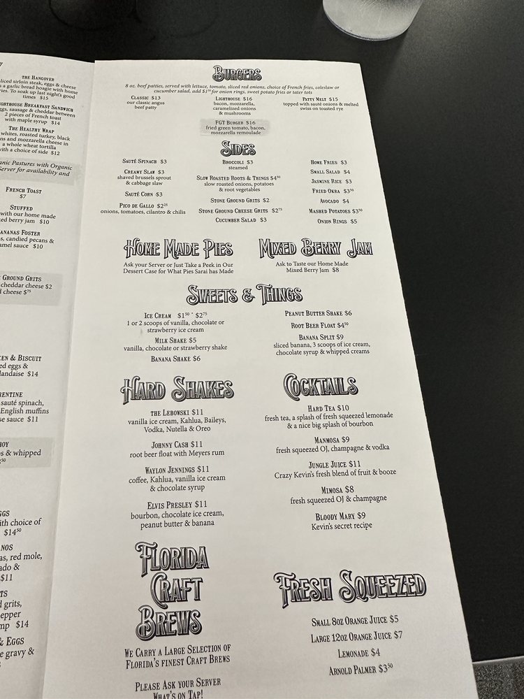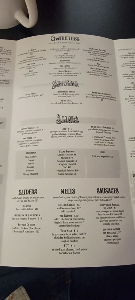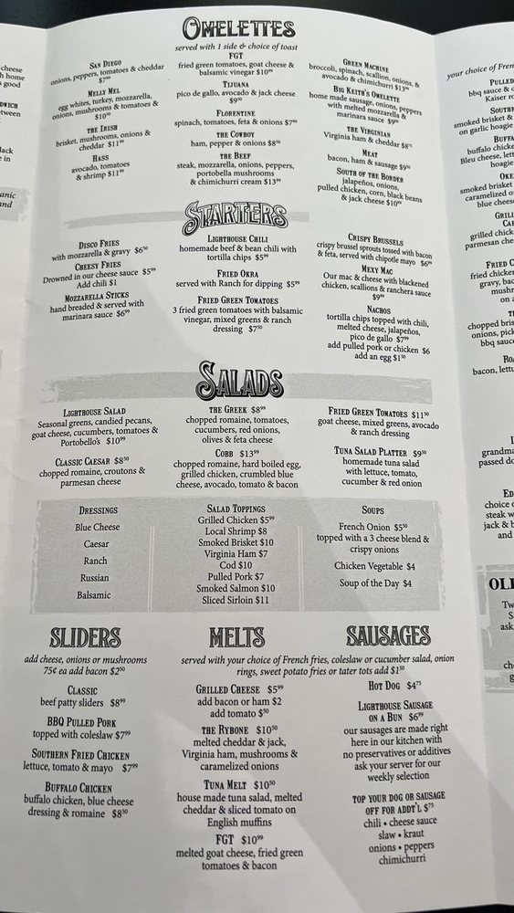 Introducing the menu at Lighthouse Diner, a nostalgic American diner located in Jupiter, FL. This diner offers a wide range of breakfast and brunch options, from classic omelettes like The Virginian with country ham & cheddar to unique creations like the Crawdaddy with crawfish, peppers & onions. Known for its friendly service and great vibe, Lighthouse Diner has become a popular community gathering spot. Customers rave about the delicious food, with favorites like the Melly Melt omelette and the shrimp po boy sandwich. The atmosphere exudes a classic diner feel with a modern twist, offering a perfect spot for locals and vacationers alike. With a full bar, outdoor seating, and wheelchair accessibility, Lighthouse Diner caters to a wide range of guests looking for a memorable dining experience.